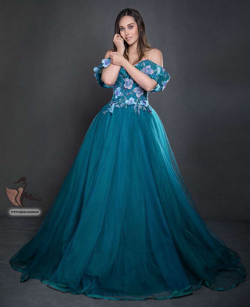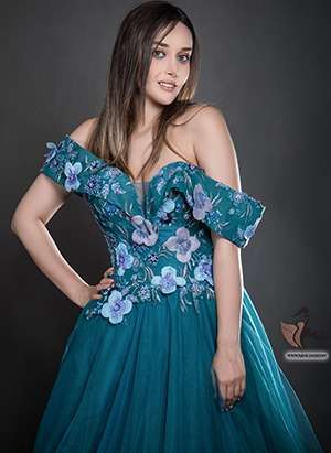 This teal floor length gown features off the shoulder sleeves and a sweetheart bodice with a sexy mesh inset. The eye-catching bodice is decorated with hand sewn delicate beading, sequins and crystals. The bodice also has embroidery and is adorned with elaborate floral applique. The voluminous skirt is made of shimmering chiffon. This gown is available in multiple colours and has an adjustable corset design for a perfect fit
